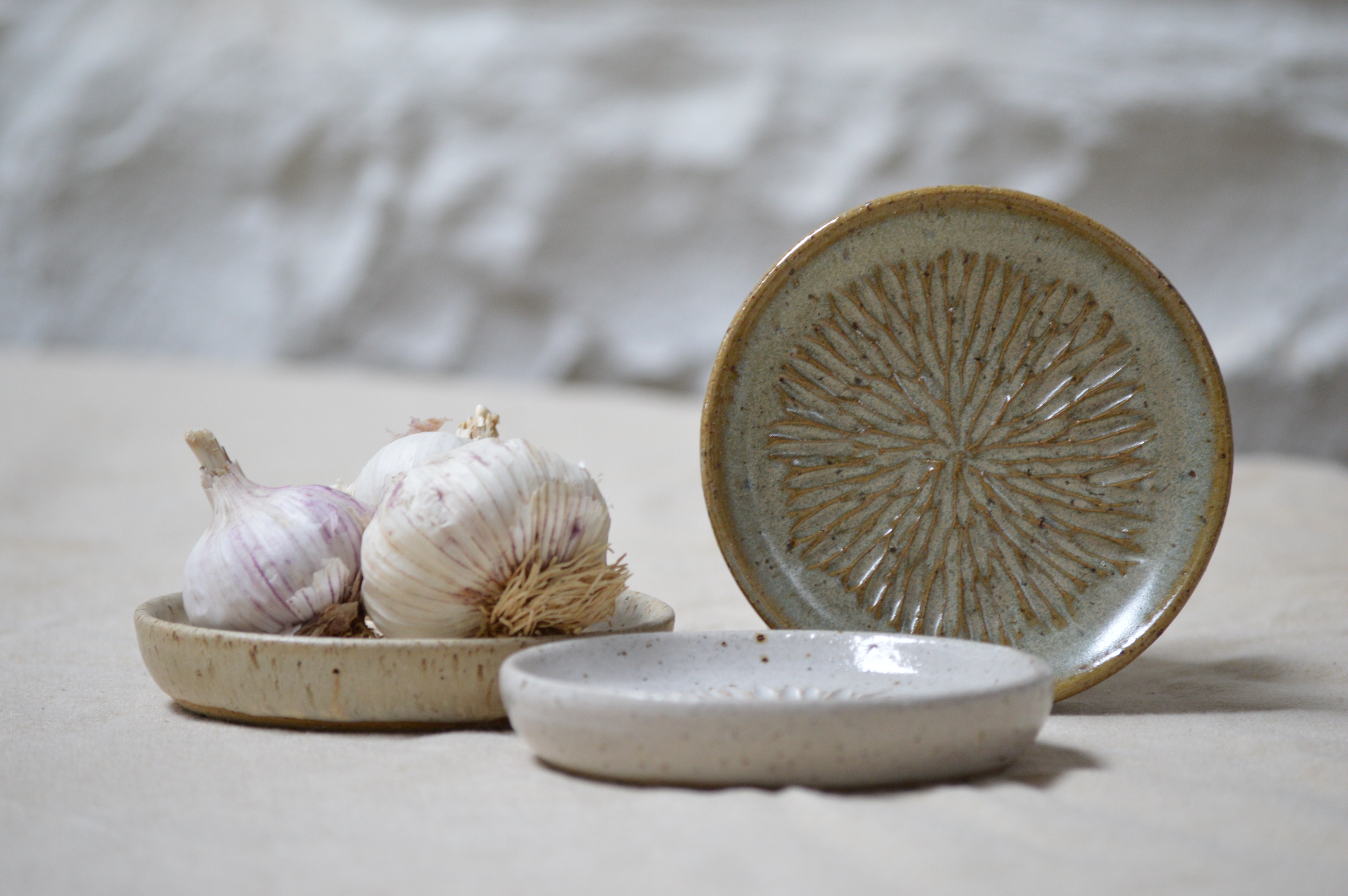 Welcome to the new hero in your kitchen, the grater plate. Perfect for grating garlic or ginger! Our striking dinnerware will make any meal memorable and look amazing in your dining room or restaurant. Beautifully designed, sturdy, and chip-resistant. Each plate in our dinnerware collection is handmade with the highest level of care and quality. We use a special stoneware body that has a speckled texture and buff in colour. They are glazed and fired at 1280 degrees which makes them incredibly long-lasting. Being handmade, each one is unique with their own character. While we recommend hand washing as the safest method of cleaning, this piece is dishwasher (and microwave) safe. My makers mark is on the base. (eb)